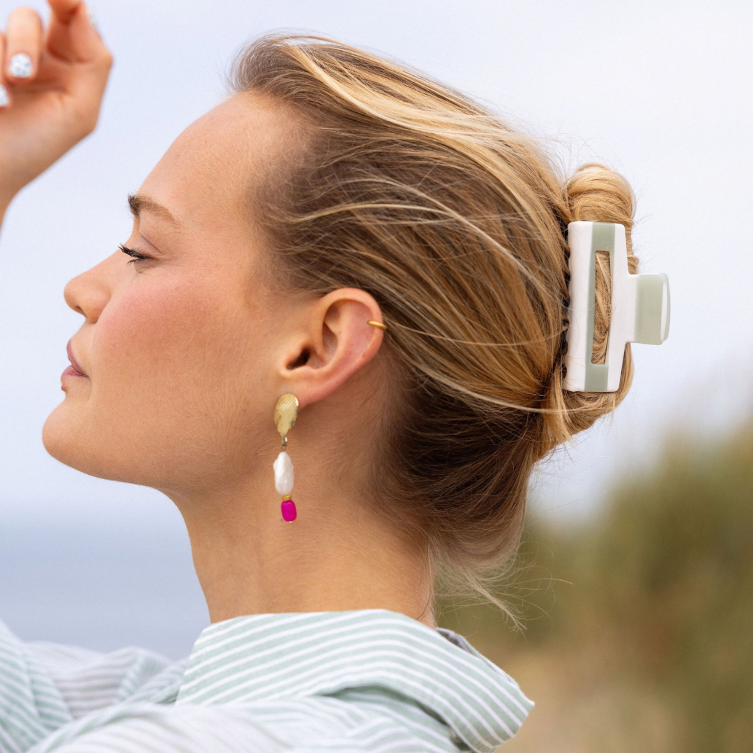 Nuestras pinzas para el cabello están hechas de acetato de celulosa, un bioplástico vegetal certificado por ISCC PLUS. En comparación con el plástico derivado del petróleo, el acetato es más sostenible y biodegradable. Los componentes de acetato y metal han sido probados y se ha comprobado que están libres de sustancias nocivas como plomo, cadmio y ftalatos.