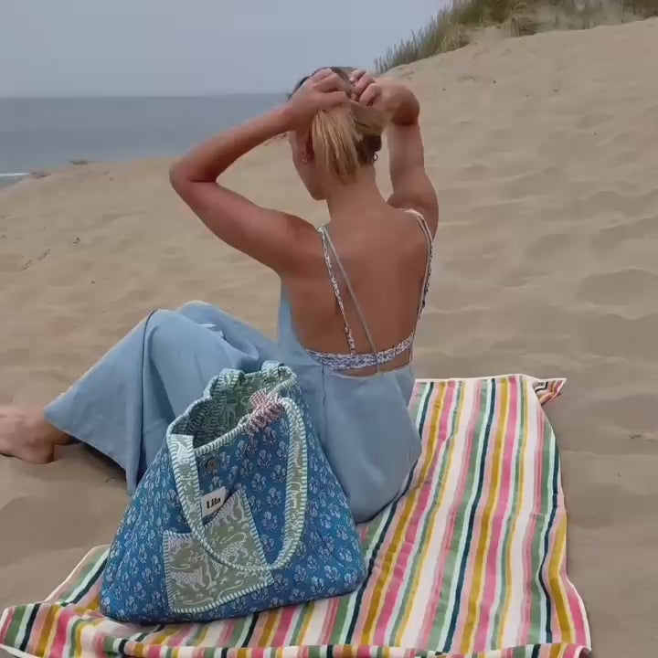 Los alegres estampados de nuestros bolsos y neceseres se imprimen a mano con una técnica centenaria llamada impresión en bloque. Se utilizan sellos de madera para transferir los patrones uno a uno a la tela.